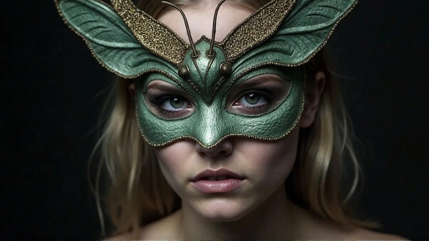 Behind the mask is a tired wooden face. A few butterflies rest on top of his bald head.